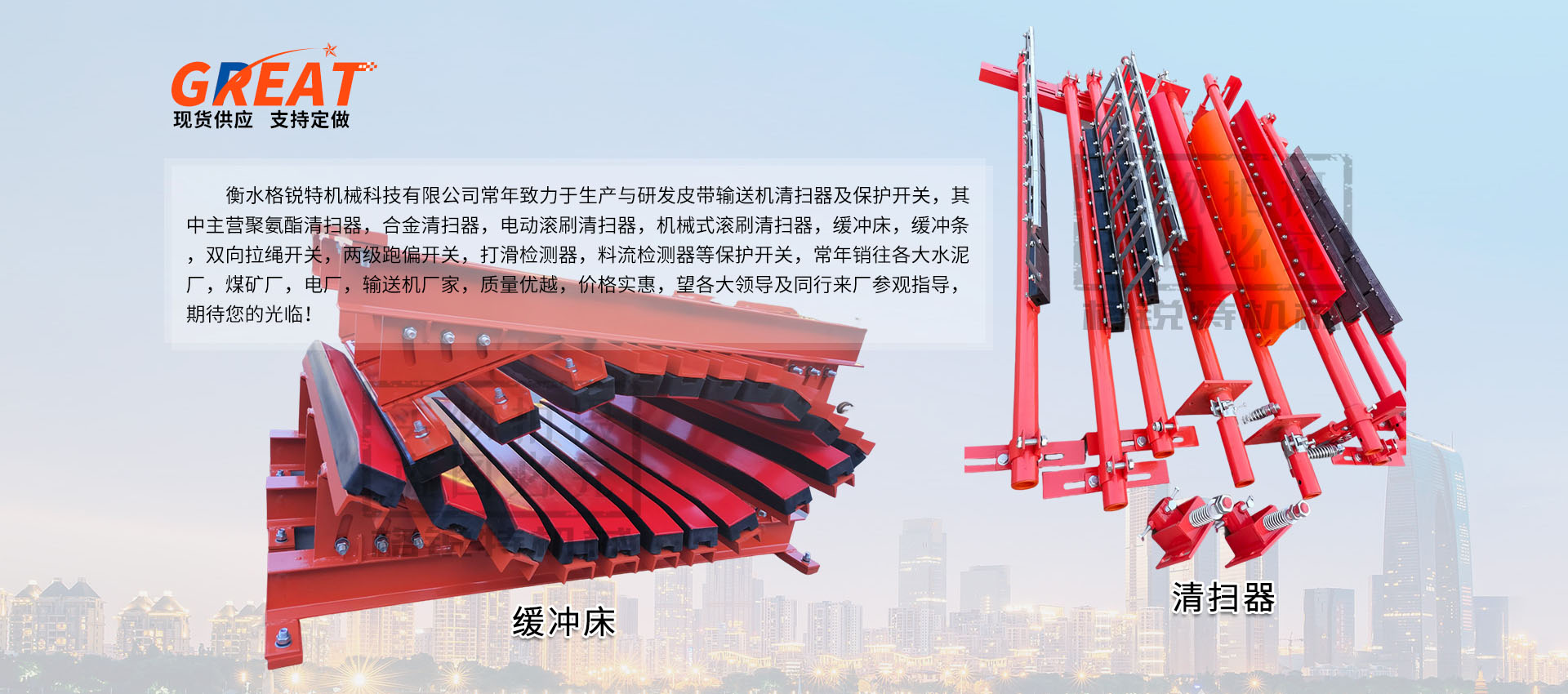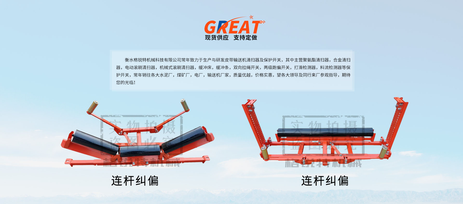 衡水格銳特機(jī)械科技有限公司常年致力于生產(chǎn)與研發(fā)皮帶輸送機(jī)清掃器及保護(hù)開關(guān),其中主營聚氨酯清掃器,合金清掃器,電動(dòng)滾刷清掃器,機(jī)械式滾刷清掃器,緩沖床,緩沖條,雙向拉繩開關(guān),兩級(jí)跑偏開關(guān),打滑檢測(cè)器,料流檢測(cè)器等保護(hù)開關(guān),常年銷往各大水泥廠,煤礦廠,電廠,輸送機(jī)廠家,質(zhì)量優(yōu)越,價(jià)格實(shí)惠,望各大領(lǐng)導(dǎo)及同行來廠參觀指導(dǎo),期待您的光臨?。。?/p>